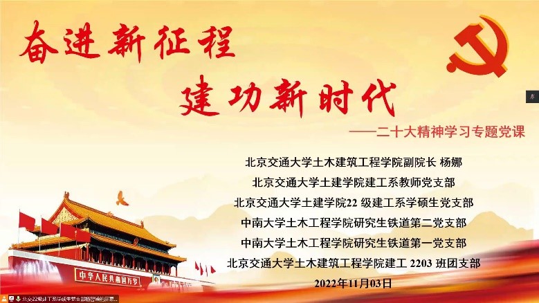 2022年11月3日19:30,新葡的京集团35222vip研铁道第一、二党支部和北京交通大学土木建筑工程学院22级建工系学硕生党支部等三个党支部关于党的二十大精神共建党课学习在线上如期举行。本次专...